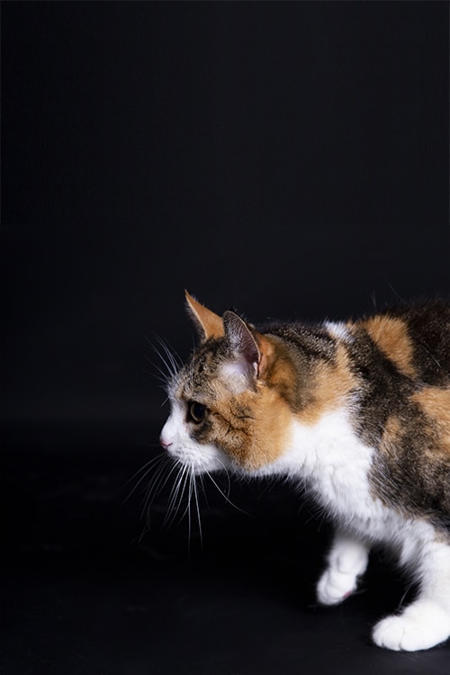 In de studio heb ik een witte en een zwarte achtergrond. Luna heb ik op beide gefotografeerd, omdat ze zoveel verschillende kleuren heeft. Ook maak ik altijd wat foto’s samen met het baasje. De band tussen mens en dier is zo mooi! En voor het baasje is dit natuurlijk ook leuk om te hebben als herinnering.
